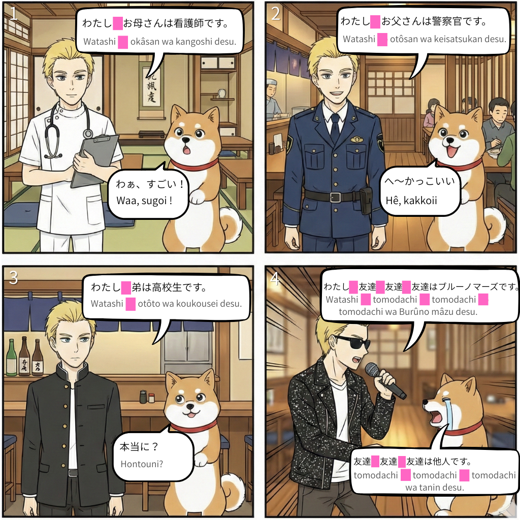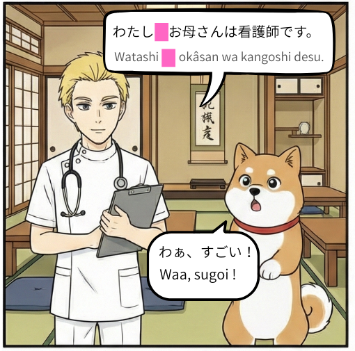 Ken: My mother is a nurse. Shiba: Wow, that’s amazing!